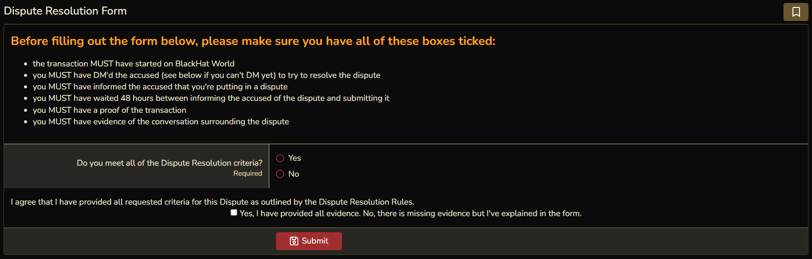 Any member who has had a genuine issue with a seller or buyer on BlackHatWorld may submit a dispute.